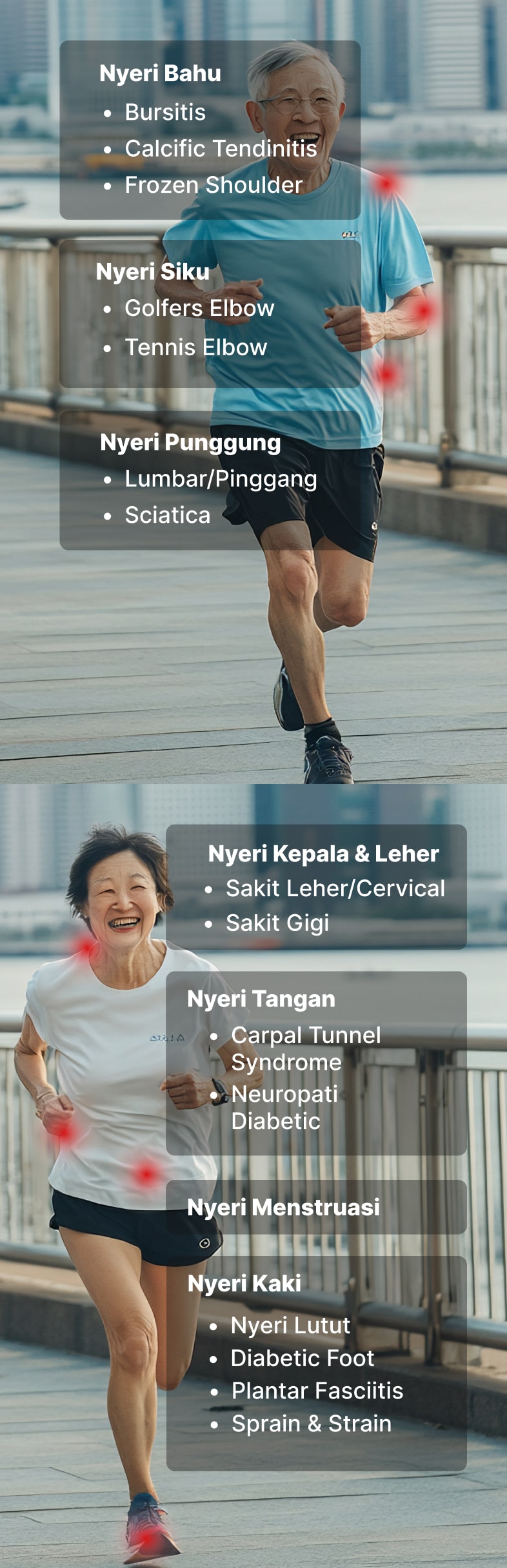 “Alat terapi dengan kombinasi 3 teknologi terkini yakni Low Level Laser, TENS, dan NMES. Satu-satunya alat terapi kesehatan portable 3 in 1 pertama di Indonesia yang sudah terakreditasi AKL oleh Kemenkes RI.
